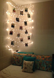 O modalitate de decorare foarte interesanta, dar ceva mai laborioasa, o reprezinta "desenele" cu luminite de Craciun. Cu ajutorul unei ghirlande de beculete si al unei bande adezive foarte bune poti realiza pe pereti braduti, stelute sau oameni de zapada. Bradutul de pe perete poate fi chiar impodobit: noi iti sugeram fulgii de zapada din hartie sau pozele celor dragi. De asemenea, poti opta pentru un aranjament de colt: uneste fiecare din cei doi pereti care formeaza coltul camerei cu ajutorul unei ghirlande de luminite. Poti imbunatati acest ornament prinzand de ghirlanda obiecte usoare: poze sau decoratiuni din hartie pentru Craciun.