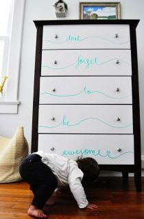 Ei, ce bine ar fi fost sa avem la indemna o astfel de solutie in copilarie... De multe mustruluieli am fi scapat! Cei mici vor fi incantati ca de acum inainte vor avea un dulapior numai bun sa-si exerseze talentul de Picasso. Iata cum un banal dulap cu sertare se poate transforma intr-o piesa de mobilier atat de vesela si colorata! Vestea cea buna? Daca ai un dulap asemanator si vrei ca bebe sa aiba o „panza” la vedere unde se poate distra cu markerul ori, daca nu esti inca mamica, vrei sa scrii si sa stergi dupa bunul plac cuvinte care te inspira, poti realiza si tu o astfel de opera de arta precum cea din imaginea de mai jos. Singura parte mai dificila in tot acest proces este scoaterea manerelor, care s-ar putea sa-ti dea ceva batai de cap.
