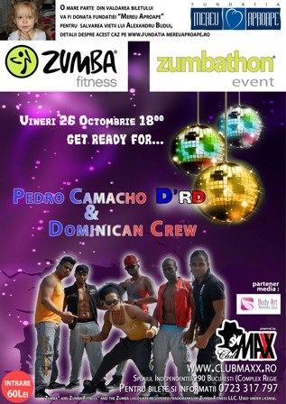 Pedro Camacho, unul dintre cei mai cunoscuti instructori de Zumba din Europa si SUA, te asteapta pe 26 octombrie incepand cu ora 18:00 in Club Maxx la Caribbean Disco Party- Zumba Masterclass, primul eveniment Zumbathon din Bucuresti. Asta inseamna ca petrecerea este inclusa, oficial, in programul de evenimente caritabile al Zumba International, care poate fi organizat doar de catre un membru ZIN (zumba instructor network).