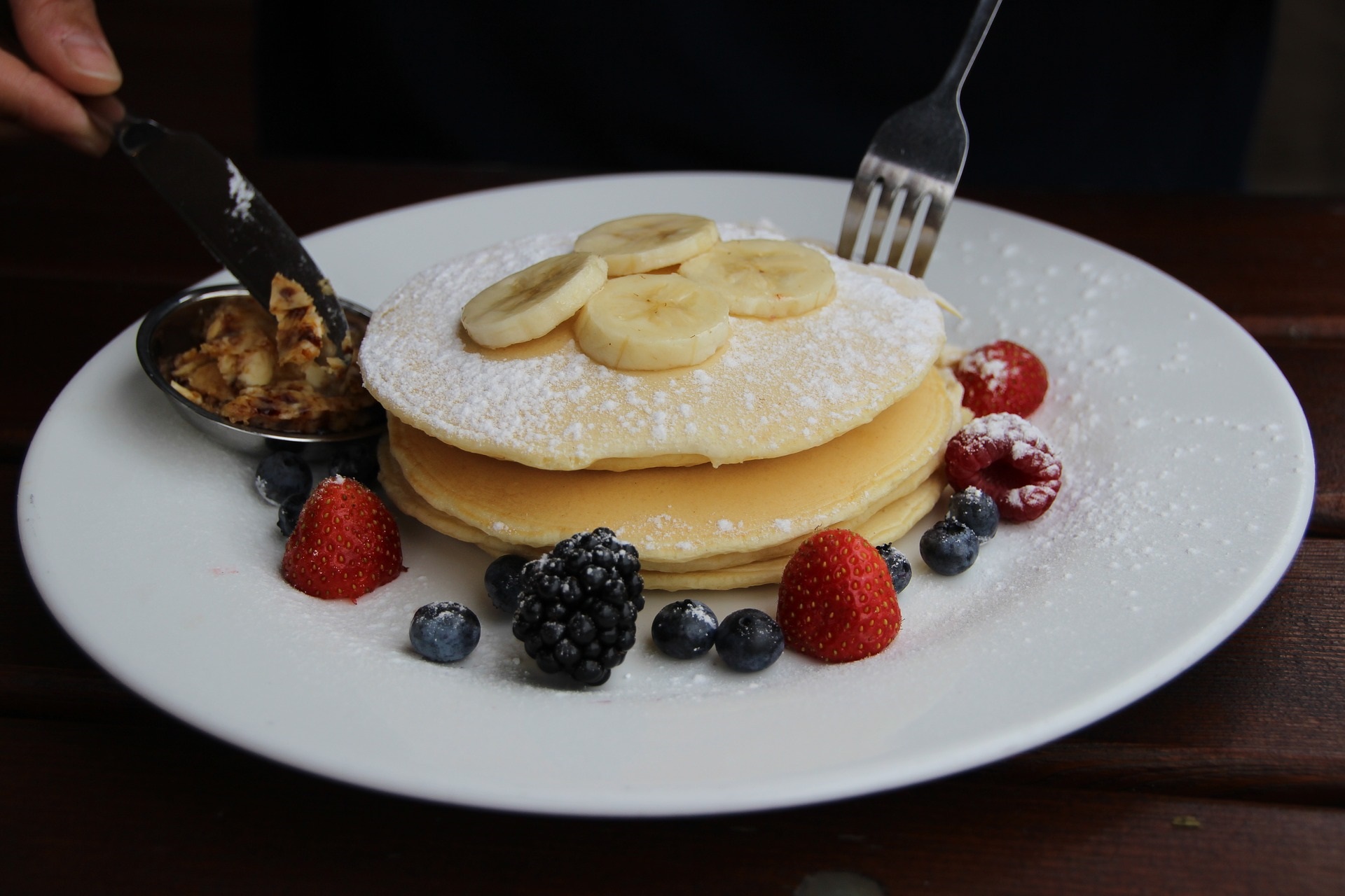 Poți servi clătitele imediat, cu sirop de arțar, cremă de cocos, scorțișoară, fulgi de cocos sau banană feliată.