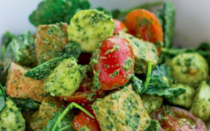 Citeste si incearca si tu reteta de salata Caprese cu tofu si sos pesto, pentru un pranz light si absolut delicios!