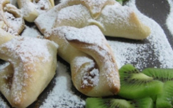 -In unul din colturile patratului puneti cate o jumatate de lingurita de gem cu nuci. Incepeti cu acelasi colt si rulati cornuletele.