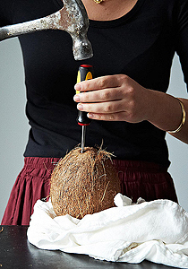 2. Foloseste surubelnita si ciocanul pentru a gauri nuca de cocos in cele trei adancituri de culoare inchisa. Scurge apa din nuca de cocos si bucura-te de gustul ei!