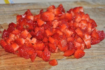 3. Taie capsunile in cuburi mici si pune-le in castroane, fara sa amesteci.