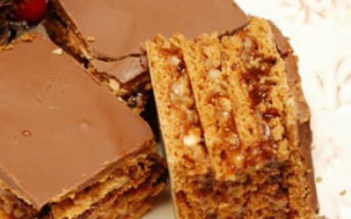 Caramelizeaza 150 gr de zahar si adauga 50 gr de unt peste el, amestecand bine. Produsul final trebuie impartit in trei portii, avand grija sa ungi fiecare foaie coapta anterior cu cate putin din compozitia caramelizata.