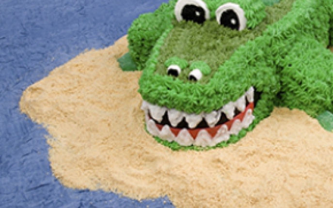 Tortul-crocodil se realizeaza dintr-un blat oval, care va reprezenta corpul, si un blat dreptunghiular, din care vei decupa coada si labele din fata. O pereche de labe o vei atasa in apropierea capului, cealalta pereche - acolo unde incepe coada. Pentru deliciosul tort in forma de crocodil pe care i-l pregatesti celui mic iti sugeram sa folosesti crema de fistic si ciocolata, insa daca pregatesti acest tort pentru un adult, merita sa incerci combinatia de gusturi menta-ciocolata. In acest ultim caz, insiropeaza blatul cu sirop de menta. Pregateste o crema de ciocolata si inca una alba. Unge feliile tortului cu crema de ciocolata. Pielea cea verde a crocodilului se obtine adaugand in crema alba colorant, insa nu uita sa pastrezi putina crema alba pentru ochi, nas si dinti. Poti orna spinarea crocodilului cu jeleuri si drajeuri verzi.