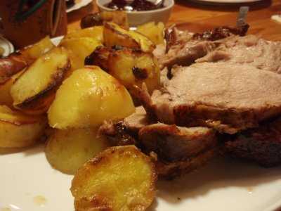 Pui pe farfurie cartofii copti alaturi de carnea de porc prajita. Delicios!