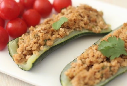 4. La sfarsit, adauga sucul de lime, maioneza si frunzele de patrunjel si amesteca bine. Ia compozitia si imparte-o in doua, umple dovleceii cu ea si pune totul la cuptor pentru rumenire, insa nu mai mult de 5 minute.
