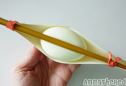 Operatiunea trebuie sa inceapa atunci cand ouale fierte tari sunt inca fierbinti, pentru a fi mai usor de modelat. Curata fiecare ou de coaja, plaseaza-l in scobitura formata in interiorul cartonului si creeaza presiune asupra lui cu betisorul pe care il fixezi la ambele capete cu cate un elastic.