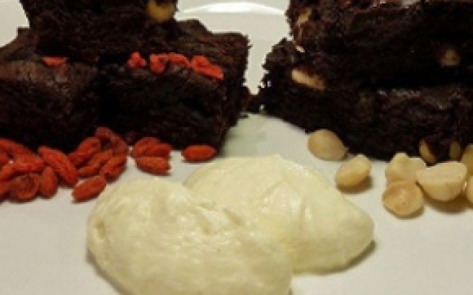 Se incalzeste cuptorul la 165 grade C. Unge tava de copt cu putin ulei si apoi presarra cu faina, pentru a nu se lipi. Intr-un vas mai mare, se adauga untul topit si xylitolul si se amesteca bine, folosind un mixer, pana la omogenizare. Se presara pudra de cacao. Apoi se adauga extractul de vanilie si ouale, unul cate unul. Adauga in ploaie faina fara gluten si praful de copt. Se lasa sa se patrunda bine. Adauga, in timp ce amesteci, fructele de padure Goji, nucile de Macadamia si ciocolata neagra.