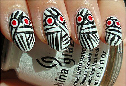 Modelele de unghii pentru Halloween pot fi realizate chiar la tine acasa daca te inarmezi cu niste sticlute de oja colorata si cu ceva rabdare. De exemplu, poti incerca un model simplu de facut, care aduce aminte de celebrul film "Mumia".
