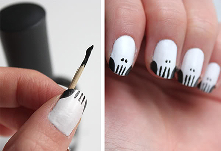 Penultima etapa in realizarea acestui model de unghii pentru Halloween o constituie desenarea cavitatilor oculare ale craniilor. Pentru aceasta, trebuie sa te folosesti de coada pensulei subtiri si de oja neagra.