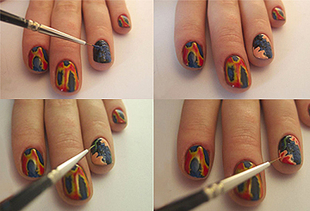 Pentru inceput aplica un strat de oja albastra pe toate unghiile, cu exceptia celor de la inelar si de la degetul mare. Cand aceasta s-a uscat complet, aplica un strat de oja neagra, de data aceasta pe fiecare unghie in parte. In continuare, aplica, pe rand, cate un strat de oja galbena, orange si rosie doar pe unghiile de la aratator, de la degetul mijlociu si de la degetul mic. Ai grija ca fiecare strat sa fie uscat atunci cand il aplici pe urmatorul.