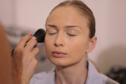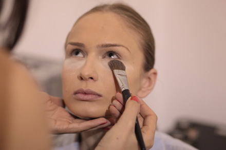 Aplicam o pudra mai inchisa, compacta, pe zonele externe ale fetei, pentru contur. In centrul fetei folosim o pudra mai deschisa. Jocul de lumini si umbre echilibreaza trasaturile si ajuta machiajul ochilor sa iasa in evidenta.
