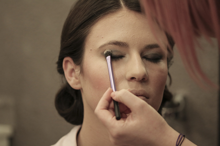 Pe pleoape, vom aplica nuante diferite de fard (fard iluminator, maro, maro deschis si maro caramiziu), pe care le vom estompa folosind mereu o pensula de blending. Incepem prin a aplica fardul iluminator in coltul intern al ochilor si pe arcada.