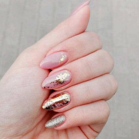 Vrei să fii și practică, pe lângă o fashionistă desăvârșită? Dacă da, folosește acest truc: alege să îți realizezi această manichiură când oja aurie pe care o ai este aproape pe terminate. Optează pentru o bază nude – fie că e vorba de alb, crem sau roz – și apoi folosește-ți creativitatea și aurul lichid rămas în sticluța de ojă și decorează-ți, pe ici pe colo, cu stropi de aur unghiile.