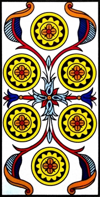 Semnificaţie: Șase de Monede este o carte a generozității, ceea ce înseamnă că fie vei primi ceva de valoare, fie vei face tu o faptă bună. Deși planul financiar este în prim plan, ceea ce primești ori oferi mai poate avea legătură și cu domeniul spiritual ori emoțional. Cele mai frumoase cadouri nu sunt întotdeauna cele materiale.