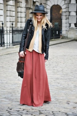 Renunță la hainele în nuanțe sobre și optează pentru o fustă lungă roz pal, o cămașă albă și o jachetă de piele. Pentru ca ținuta ta să fie și mai șic, completează cu o pălărie neagră.