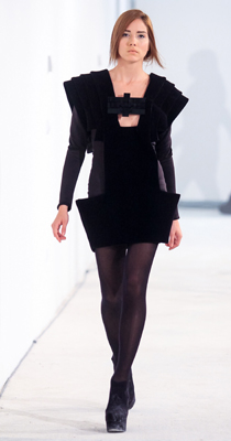 S-au folosit si taieturile clasice, cum e cea a paltonului negru, din catifeaua caserata, care are o forma "New Look", data de spatele amplu, dar si o silueta stransa cu un cordon, cu aplicatii din plexiglass.