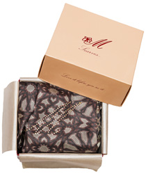 Magnolia, floare care inspira noblete si eleganta, a fost aleasa drept simbol al brandului M Scarves&Accessories, incununand experienta descoperirii pretioaselor esarfe din matase naturala. Cele patru fraze cheie inscrise cu o caligrafie superba pe laturile capacului cutiei, poarta cu sine intreaga filozofie a brandului si apropie clientul de universul aparte M Scarves&Accessories: Love it before you see it - calitatea extrem de rara a unui produs de care te indragostesti inainte de a-l vedea, See it before you feel it - impactul vizual in momentul in care deschizi ambalajul, Feel it before you touch it - senzatia de pretiozitate si de finete resimtita la atingerea hartiei de matase in care sunt impaturite esarfele, Touch it before you sense it - senzorialitatea unica a matasii care ascunde o aroma subtila de levantica.