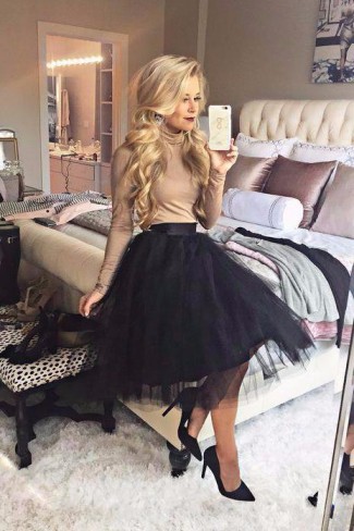 Dacă vrei să obții un look ceva mai clasic, noi te sfătuim să alegi cu încredere fustele tutu în culori închise. Rochia din tulle neagră se potrivește de minune cu un top clasic, dar și cu o pereche de pantofi negri. În cazul unui look casual, asortează-ți fusta de balerină cu o pereche de sandale în culori neutre și cu o jachetă din piele.