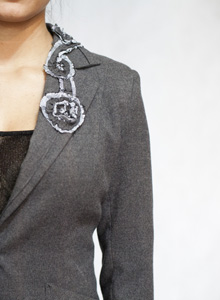 | Sa te imbraci pentru a merge la serviciu nu inseamna a lasa deoparte stilul tau personal impunandu-ti tinute care nu te reprezinta. Moda de astazi cu diversitatea ei te scoate din impas daca stii ce sa alegi. Sacoul de culoare gri cu accesorii florale, incheiat cu un singur nasture care se asorteaza cu aplicatia de pe rever este ultima linie impusa de marii designeri si care Sophy acum il pune la dispozitia domnelor. Asortat cu fusta indrazneata avand doua falduri care se deschid elegant in tiv si contrastul in linii discrete imprumutate de la sacou, creaza un costum ce poate fi purtat in orice situatie. |