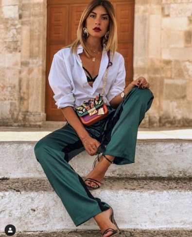 Ai o ținută glam-elegantă. Aici, mizează tot pe asortarea stilurilor și apelează la o geantă tip tote, de mână, cu aspect luxuriant. Combinațiile de fuste și rochii cu pantofi cu toc au nevoie de același tip de accesoriu de mână pentru a se dovedi reușite. Dacă vrei să intercalezi și un element opus, poți opta pentru un tricou, ca în imaginea de mai jos, sau pentru o geantă în culori vii.
