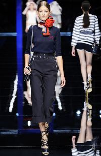 Si pentru ca intr-un articol trecut am vorbit despre stilul navy , in trend in acest sezon, nu aveam cum sa nu amintim si de nuanta de blue navy. Acest tip de albastru merge perfect in combinatie cu alb, rosu, sau galben. Pentru un stil 100% marinaresc, combina o pereche de pantaloni cu talie inalta intr-o nuanta de navy blue cu o camasa alba sau tricou in dungi.
