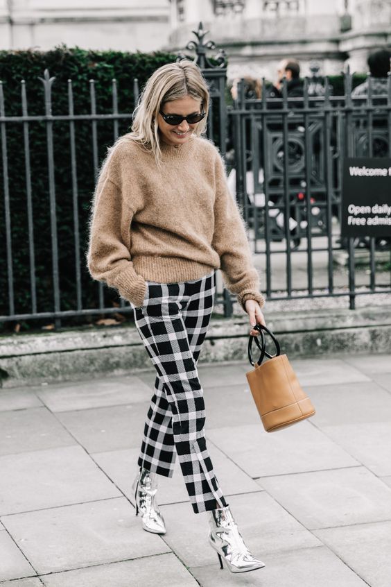 Apelează la un model moale de cașmir, pe care să îl asociezi cu pantaloni în carouri și botine argintii!
