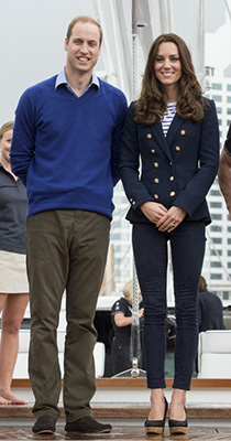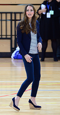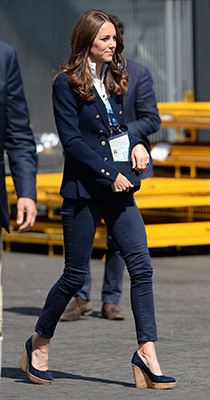 Asa se face ca de mai bine de trei ani, Kate poarta aproape aceeasi tinuta casual. Aceasta este compusa dintr-o pereche de blugi J Brand, inchisi la culoare, un blazer bleumarin semnat Smythe si o pereche de pantofi cu talpa ortopedica de la Stuart Weitzman Corkswoon. Singura piesa pe care ducesa o schimba, este topul, dar si aici variatiile sunt minore. Kate poarta mereu bluze sau camasi albe sau cu dungi albe si negre.