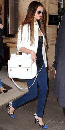 Jeansii skinny vor ramane mereu in trend, insa trebuie sa ii scoti cumva din anonimat! Selena Gomez si-a accesorizat tinuta formata din jeansi skinny si top negru, cu o pereche de pantofi cu imprimeu leopard, o geanta supradimensionata si un blazer de inspiratie masculina, care au reusit sa ii confere tinutei sale, aparent banale, o nota de eleganta.