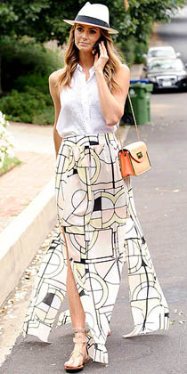 Daca ai citit articolele noastre, atunci stii foarte bine ca unul dintre cele mai populare imprimeuri ale acestui sezon, este cel animalier. Vedetele profita din plin de versatilitatea acestui print, purtandu-l in diverse tinute, atat casual cat si elegante. Olivia Palermo, vedeta al carei stil vestimentar nu are cum sa treaca neobservat, a ales sa dea o nota edgy unei tinute romantice, asortand o bluza din material fluid cu leopard print la o fusta mini, alba. Pata de culoare este data de plicul albastru, care echilibreaza perfect tinuta.