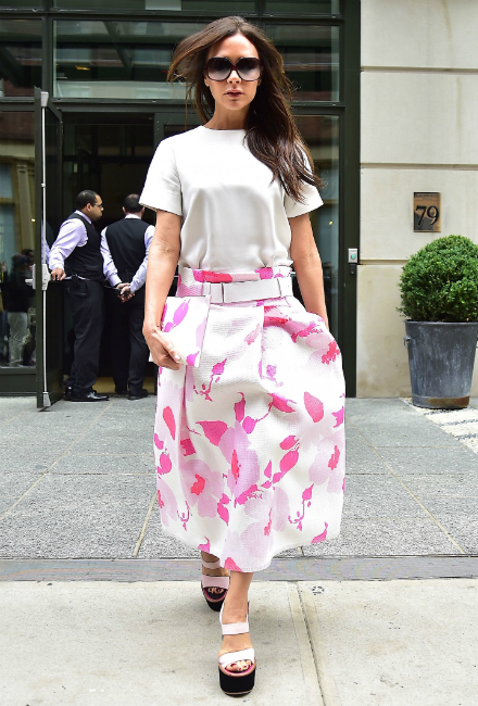Profitam de orice ocazie pentru a ne aminti de primavara, iar Victoria Beckham reuseste, cu ajutorul acestei tinute cu imprimeuri feminine, sa ne traspuna intr-un sezon mai generos cu gradele din termometru. Intr-o binemeritata pauza de la stilul minimalist, designerul arata fresh intr-o simfonie de alb si roz! Adoram liniile arhitecturale ale tinutei si modul in care vedeta si-a asortat plicul cu fusta si sandalele model flatforms.
