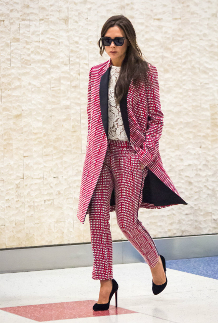 Atunci cand porti in aeroport un splendid costum Paul&Joe, impecabil croit, este semn ca esti o fashionista adevarata. Pantofii stilettos negri si camasa alba de dantela pun delicat in valoare outfitul Victoriei Beckham si ne fac sa ne dorim sa calatorim in cele mai indepartate colturi ale lumii, doar pentru a incerca si noi tinutele englezoaicei.