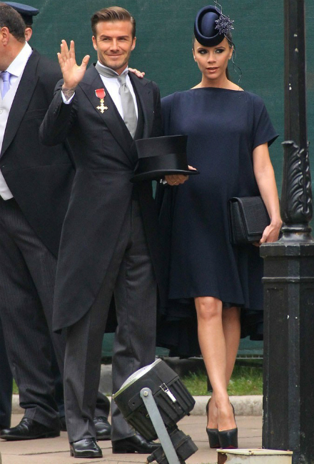 Prezenta la unul dintre cele mai importante evenimente ale secolului, nunta Printului William si a Ducesei Catherine, Victoria Beckham a dovedit, daca mai era nevoie, ca poate purta orice tinuta cu stil. In 2011, Victoria oferea lumii intregi o lectie despre cum sa te imbraci atunci cand esti insarcinata: rochia ampla, asimetrica, de un bleumarin rafinat, constituia unul dintre cele mai reusite outfituri ale evenimentului. Oferim puncte in plus pentru superba coordonare cu nu mai putin aratosul sot David.