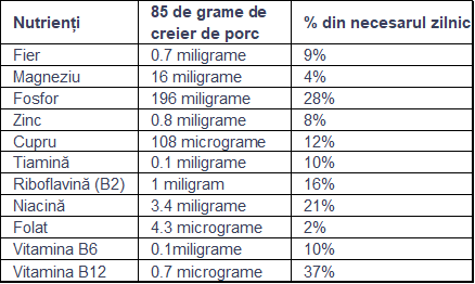 Iată care este și valoarea nutrițională a 85 de gr de creier de porc: