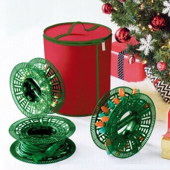 Un tambur practic cu 3 bobine pentru a infasura ghirlandele Dvs.: astfel nu me mai incurca intre ele si sunt intotdeauna gata de utilizare! Cu maner si fermoar, realizate din material plastic si poliester. Fiecare bobina insira pana la 30,5 m de cablu. . Dim. aprox. recipient: ? 33 x 28 cm
