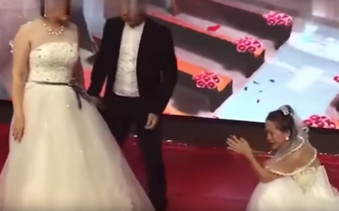 Cum era și de așteptat, întregul moment a fost filmat de nuntașii prezenți la ceremonie. Femeia a dat buzna în sală exact în momentul în care mirele primise permisiunea de a-și săruta mireasa. În filmare se vede clar cum fosta se agață disperată de el, îngenunchind în fața lui.