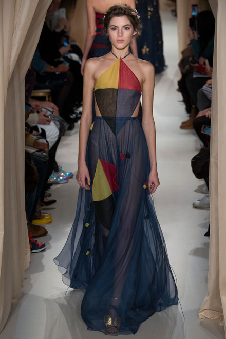 Directorii de creatie ai brandului Valentino, Maria Grazia Chiuri si Pierpaolo Piccioli au facut o veritabila demonstratie a spiritului couture, aducand moda inapoi la originile ei artistice prin manufacturile pretioase care au ornat rochiile si estetica inspirata de Marc Chagall. Cei doi designeri citeaza drept sursa de inspiratie “dragostea in forma ei cea mai pura”, iar colectia Valentino trebuie sa fi implicat multa dragoste, deoarece unele rochii au necesitat peste 3000 de ore pentru a fi cusute!