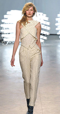 Materialele folosite in creatii au fost matasea, satinul, materialele fluide imprimeuri exotice. In ceea ce priveste culorile folosite, au predominat nuantele nude si clasicele alb/negru insa nu au lipsit nici culorile electrice.