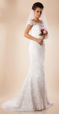 Rochia de mireasa sirena Barbara este croita din tulle brodat cu broderie aplicata la tiv. Bustul acoperit cu dantela si decolteul barcuta creeaza un look rafinat, cuceritor si in tendinte.