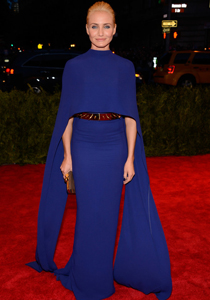 Cameron Diaz a dat un aspect glam tinutei sale maxi de un albastru-cobalt, prin asocierea cu o curea metalica aurie cu tinte, care ii marcheaza talia.