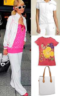 | Barbie girl Daca totusi te caracterizeaza stilul sport, insa vrei sa fii si feminine, cine alta decat Paris Hilton da un exemplu in acest sens. Combinatie de trening alb cu top roz si tenesi roz este cea mai feminine optiune. Bineinteles ca poti opta si pentru alte nuante pentru top si tenesi, insa un trening alb este cea mai indicata optiune. In imagine: Trening Nike - 320 lei, Tricou Koton - 80 lei si geanta Dasha - 89 lei.