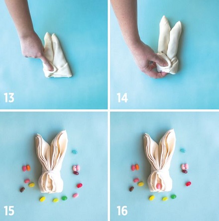 | A doua varianta de servetel decorativ pentru masa de Paste este putin mai complicata, dar odata ce inveti pasii, vei termina in cateva minute fiecare servetel. Ai nevoie de un servet din material natural si de un fier de calcat, mai ales daca servetul este dur. Iata pasii pe care trebuie sa ii urmezi daca vrei sa realizezi acest servetel decorativ in forma de iepure: | ![]() |