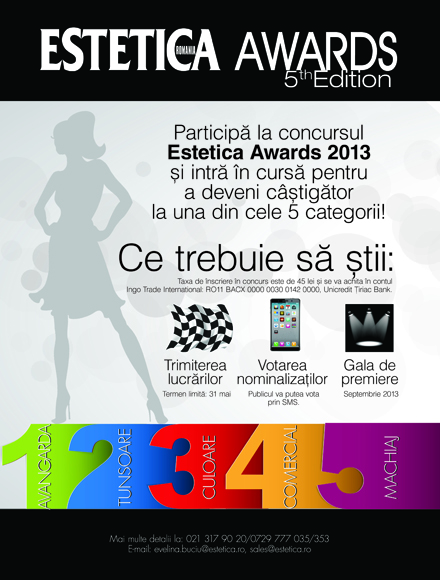 Revista ESTETICA Romania&Republica Moldova, prima publicatie profesionala dedicata saloanelor de infrumusetare din Romania, a dat startul inscrierilor in competitia profesionistilor, ESTETICA AWARDS 2013, editia a 5-a!
