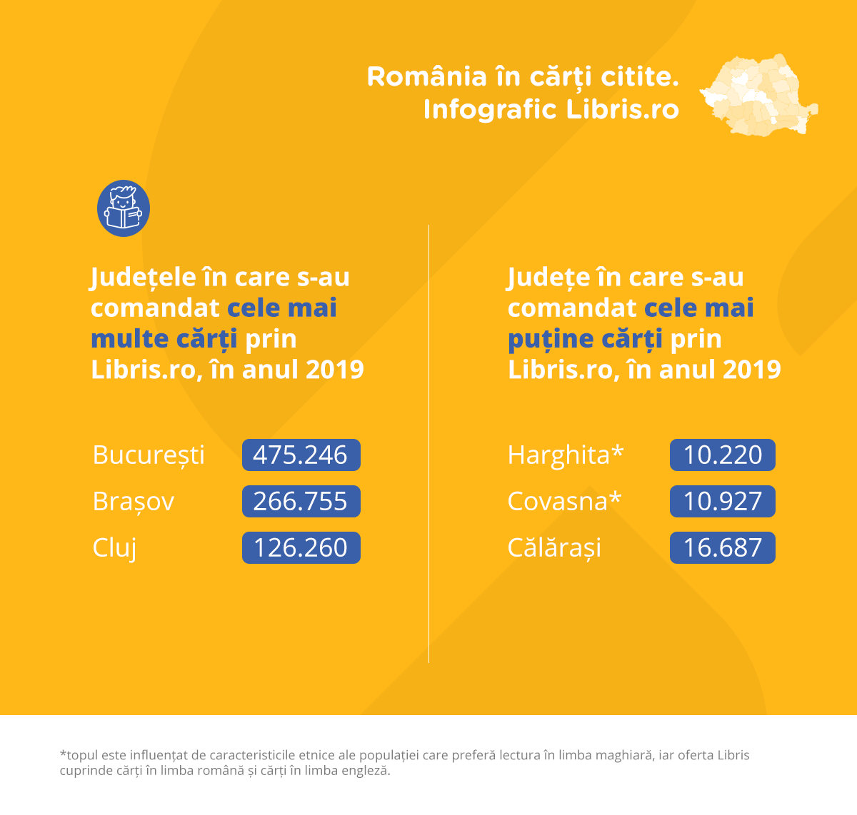 În topul celor mai active județe în ceea ce privește achizițiile de carte de pe Libris.ro Bucureștiul este urmat de Brașov (266.755 cărți), Cluj (126.260 cărți vândute), Timiș (102.171), Iași (100.095 cărți) și Sibiu (58.828 cărți). La polul opus se află județele, Botoșani (26.679 cărți), Olt (21.723 cărți), Călărași (16.687 cărți) și Teleorman (19.459 cărți).