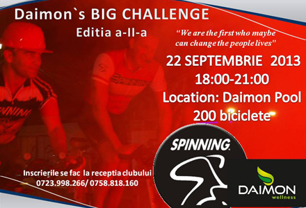 Daimon te invita pe tine si pe toti prietenii tai la cel mai mare maraton de spinning din acest an. Evenimentul va avea loc duminica, 22 septembrie, la piscina exterioara a Clubului Daimon, Bucuresti, incepand cu ora 18:00.