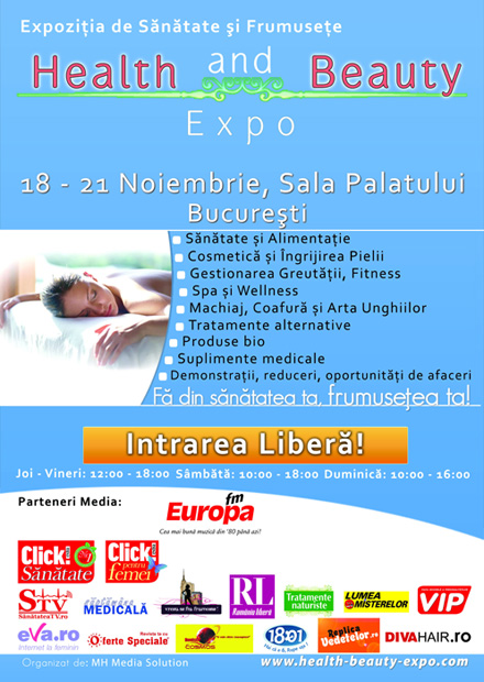MH Media Solution anunta cel mai complex eveniment dedicat sanatatii si frumusetii din Romania. Health and Beauty Expo este un concept international introdus anul acesta si in Romania. Evenimentul este dedicat sanatatii si frumusetii si are ca scop principal alaturarea celor doua domenii atat de interconectate, sub deviza "Fa din santatea ta, Frumusetea ta".