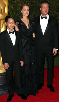 Ca de obicei, Angelina a dat dovada de eleganta si feminitate pe covorul rosu. Ea a stralucit intr-o superba rochie neagra Versace, pe care a accesorizat-o doar cu o pereche pretioasa de cercei, in timp ce sotul ei a imbracat un costum semnat Saint Laurent. La acest eveniment, cei doi au venit insotiti de fiul lor de 12 ani, Maddox, care la fel ca si tatal sau, a pasit pe covorul rosu intr-un costum foarte elegant.