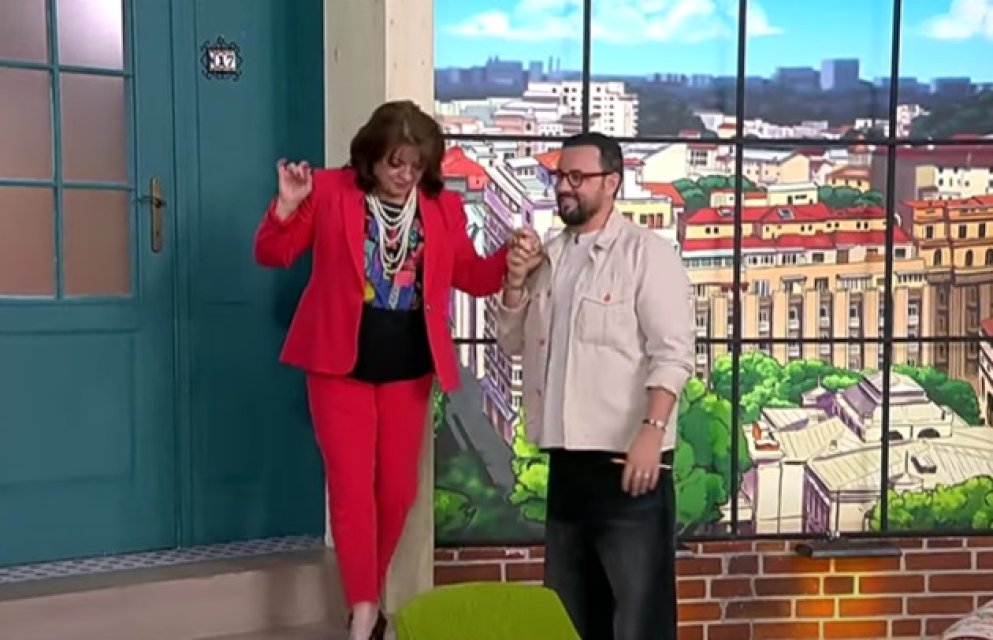 În emisiunea „La Măruță”, fosta crainică a apărut într-un costum roșu, din picioare nu i-au lipsit tocurile, iar la gât a avut un colier voluminos din mărgele.